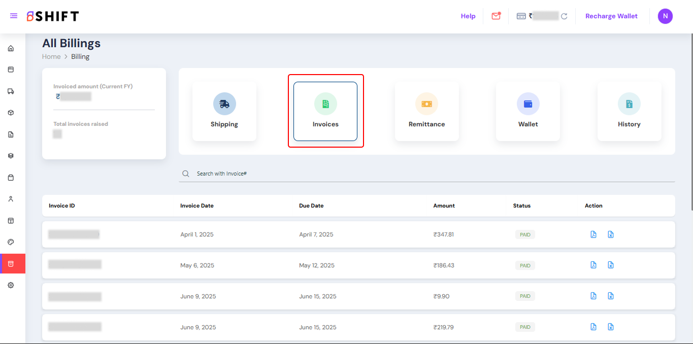 The Billing Module in Shift gives you a clear and organized view of all billing-related details for your shipments. It is divided into five tabs, with each tab focusing on a specific part of the billing process: Shipping, Invoices, Remittance, Wallet, and History.