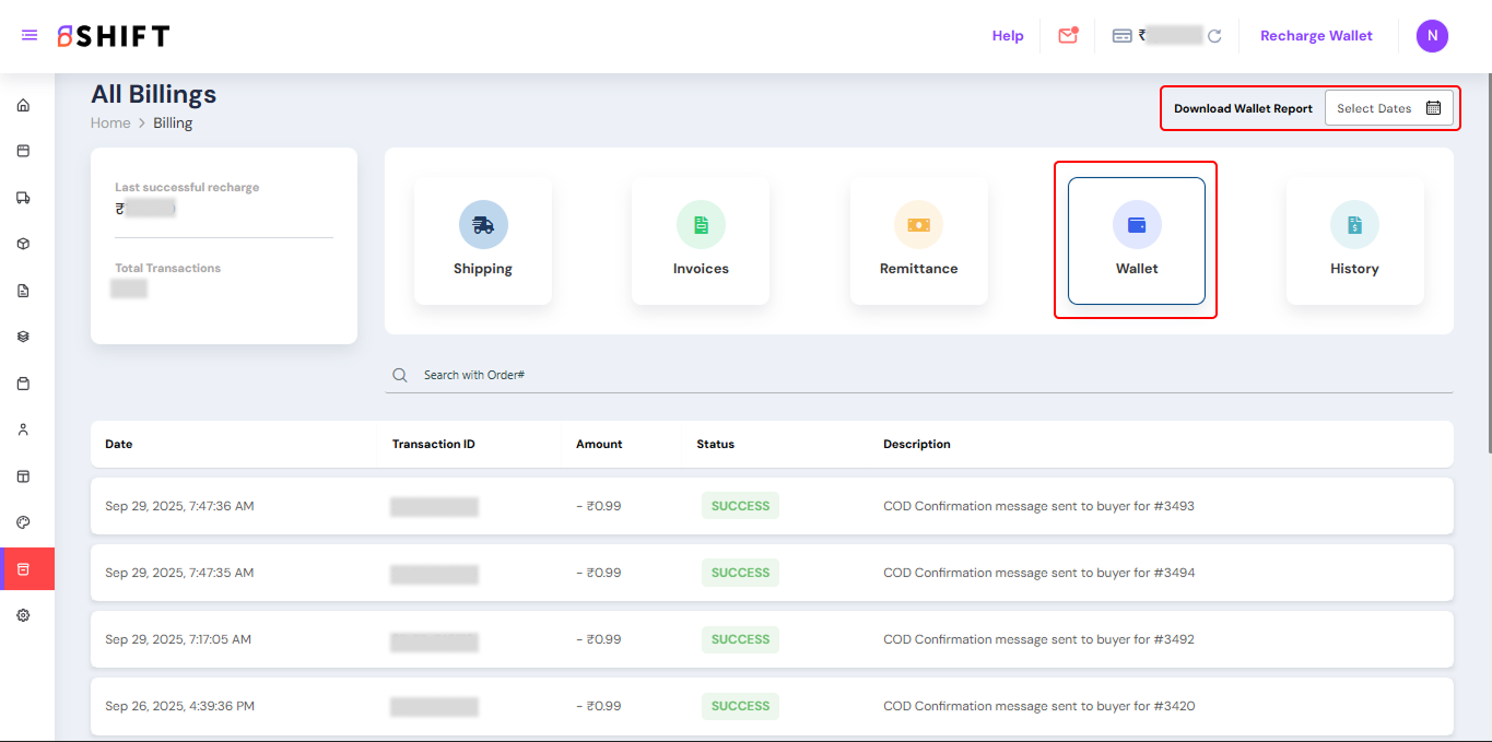 • Wallet – The Wallet tab provides a complete overview of your billing transactions, including wallet recharges, weight discrepancy (WD) charges, shipping charges, and WhatsApp communication charges, and any account-level deductions or adjustments.