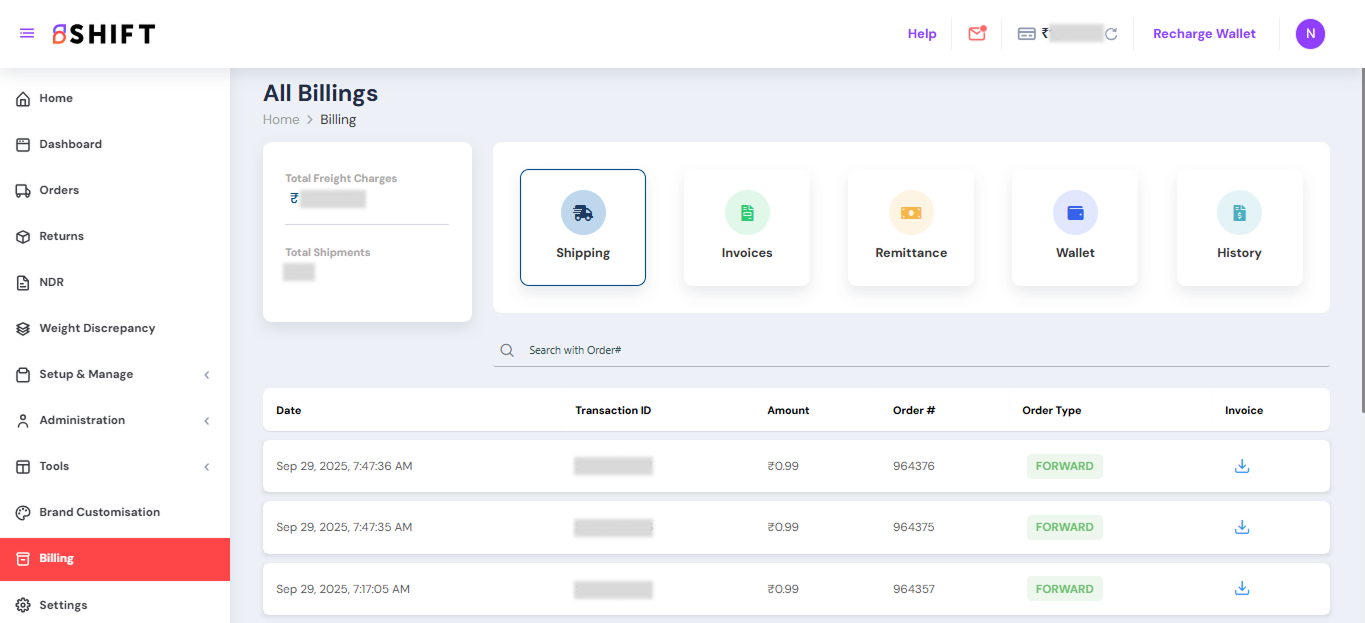 The Billing section on Shift gives you complete visibility into your logistics expenses, payments, and remittance history, all in one place. Whether you’re tracking shipping charges, downloading GST invoices, monitoring COD remittances, or reviewing your wallet transactions, this section ensures transparency and simplifies financial management for your business.