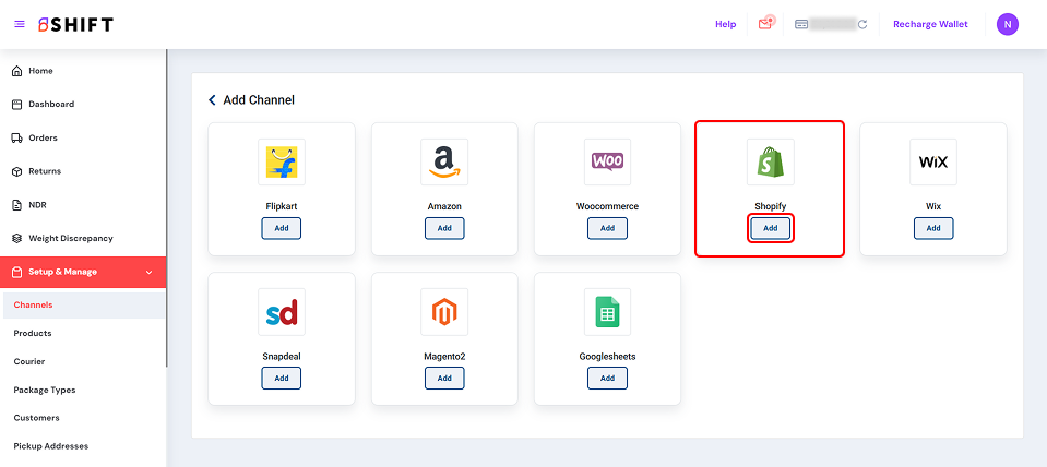 • Click “Add” under the Shopify card.