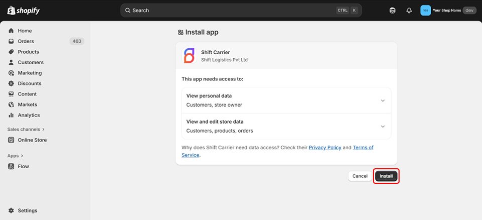• You will be redirected to Shopify’s app installation screen.