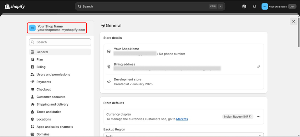 In Shopify admin, check the top-left for the URL → Copy the yourshopame.myshopify.com domain.