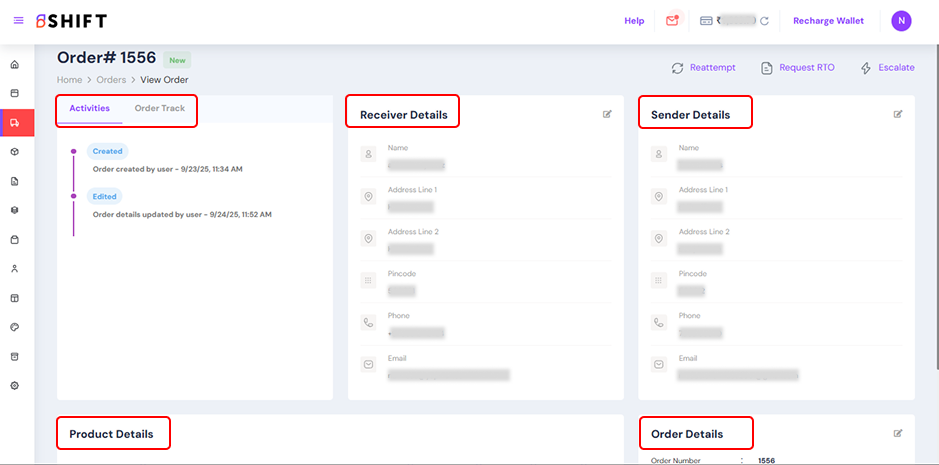 Order Details: Overview of the order, Order Number, Payment Method, Dimension, Weight, Order Value.