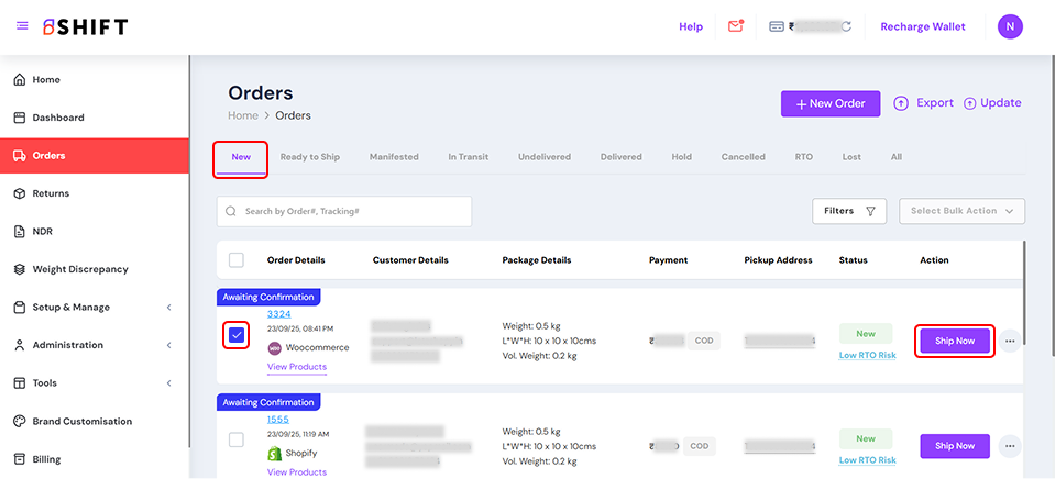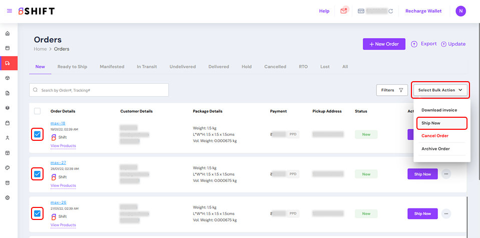 Go to the “New” tab and select the orders you want to ship by clicking on the checkbox next to each order.