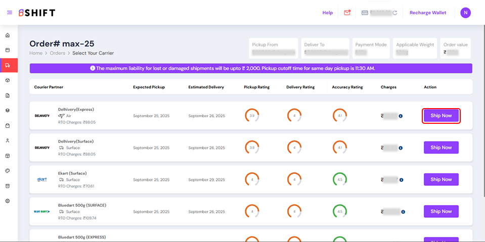 Click on the “Ship Now” button from the select bulk action dropdown to process the shipment.