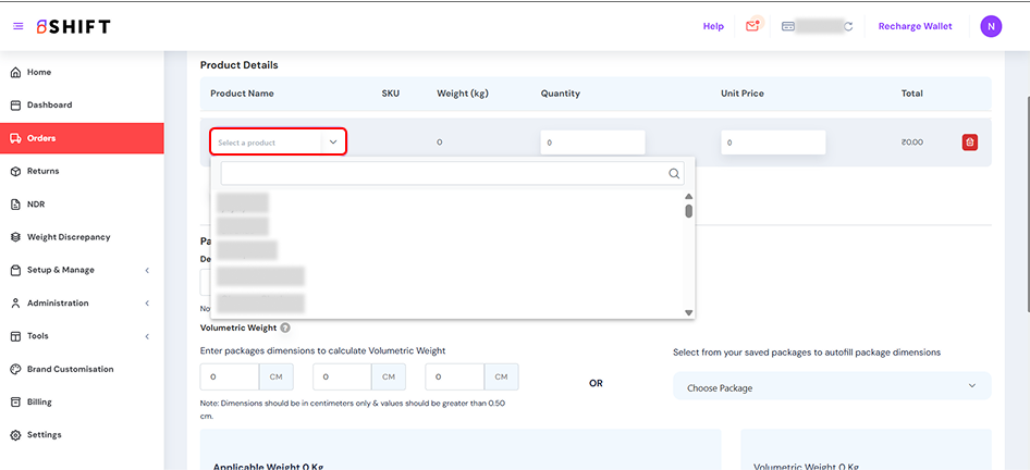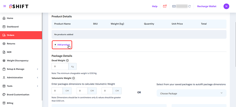 - Then, enter the product details including Product Name, SKU, Weight, Quantity, Unit Price, and Total. You can continue adding multiple products in the same way or choose from the list of products you have already created.