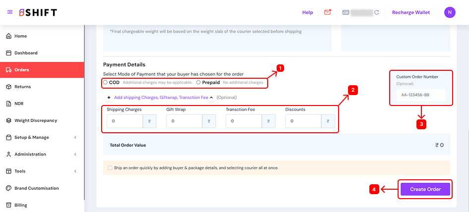 - The system will automatically calculate the Total Order Value after applying charges and discounts.