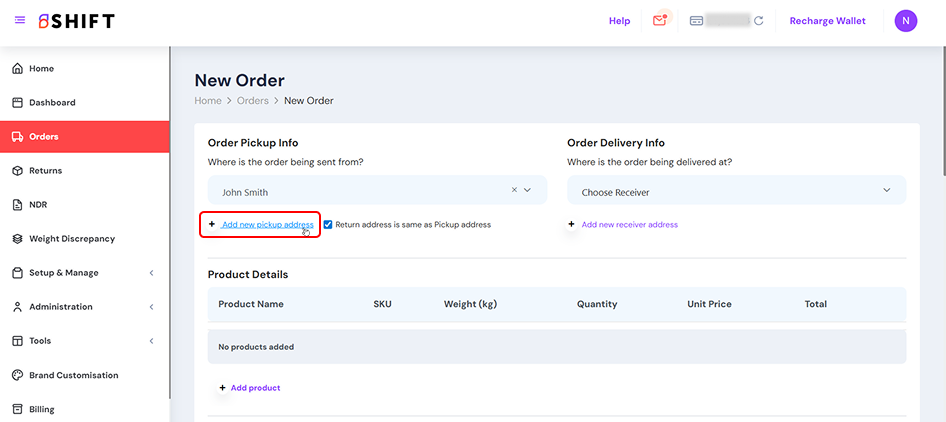 - If no address is saved, or if you want to add a new one, click “Add New Pickup Address” and fill in the required details.