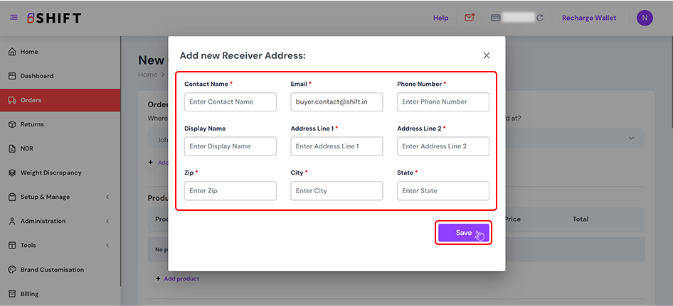- To add a Receiver Address, you need to enter the Contact Name, Email Address, and Phone Number of the recipient, along with a Display Name for easy identification. Next, provide the full Address, including the City, State, and Pincode to ensure accurate delivery.
