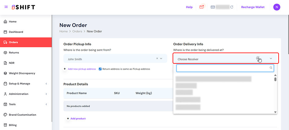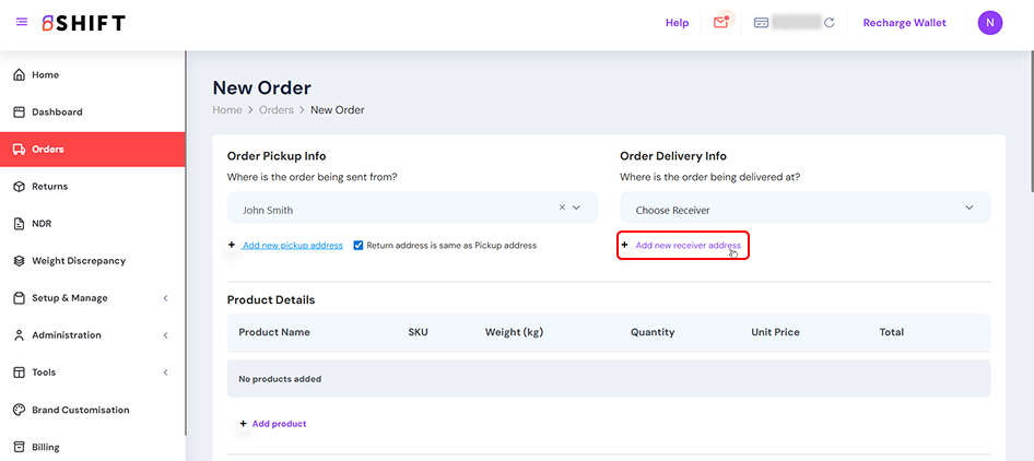 - If no address is saved, or if you want to add a new one, click “Add New Receiver Address” and fill in the required details.