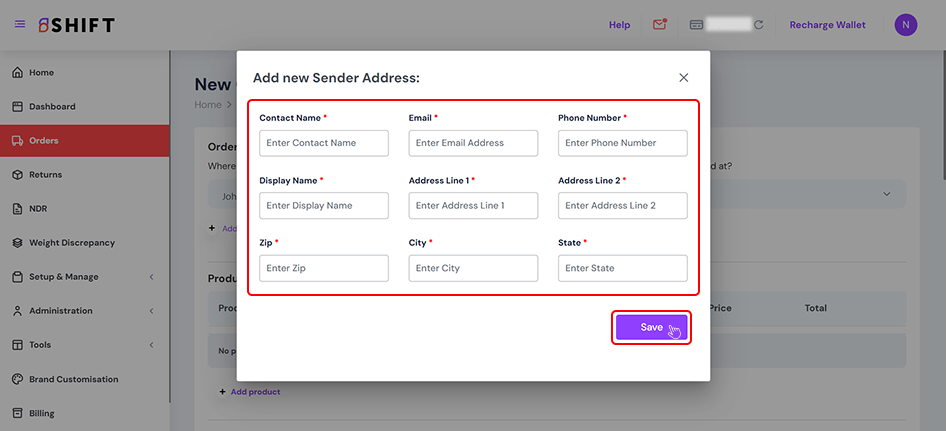 - When you click Add New Pickup Address, a modal will open where you need to enter the Sender Address details. This includes the Contact Name, Email Address, and Phone Number of the sender, along with a Display Name for easy identification. You must also provide the complete Address, including the City, State, and Pincode, to ensure accurate pickup and dispatch.